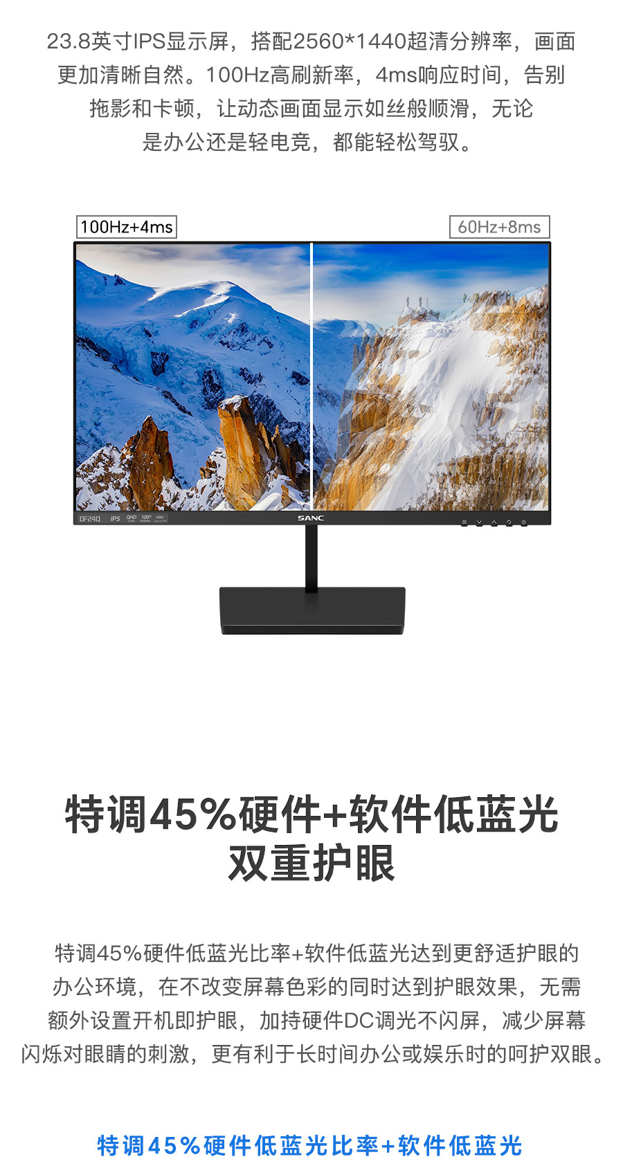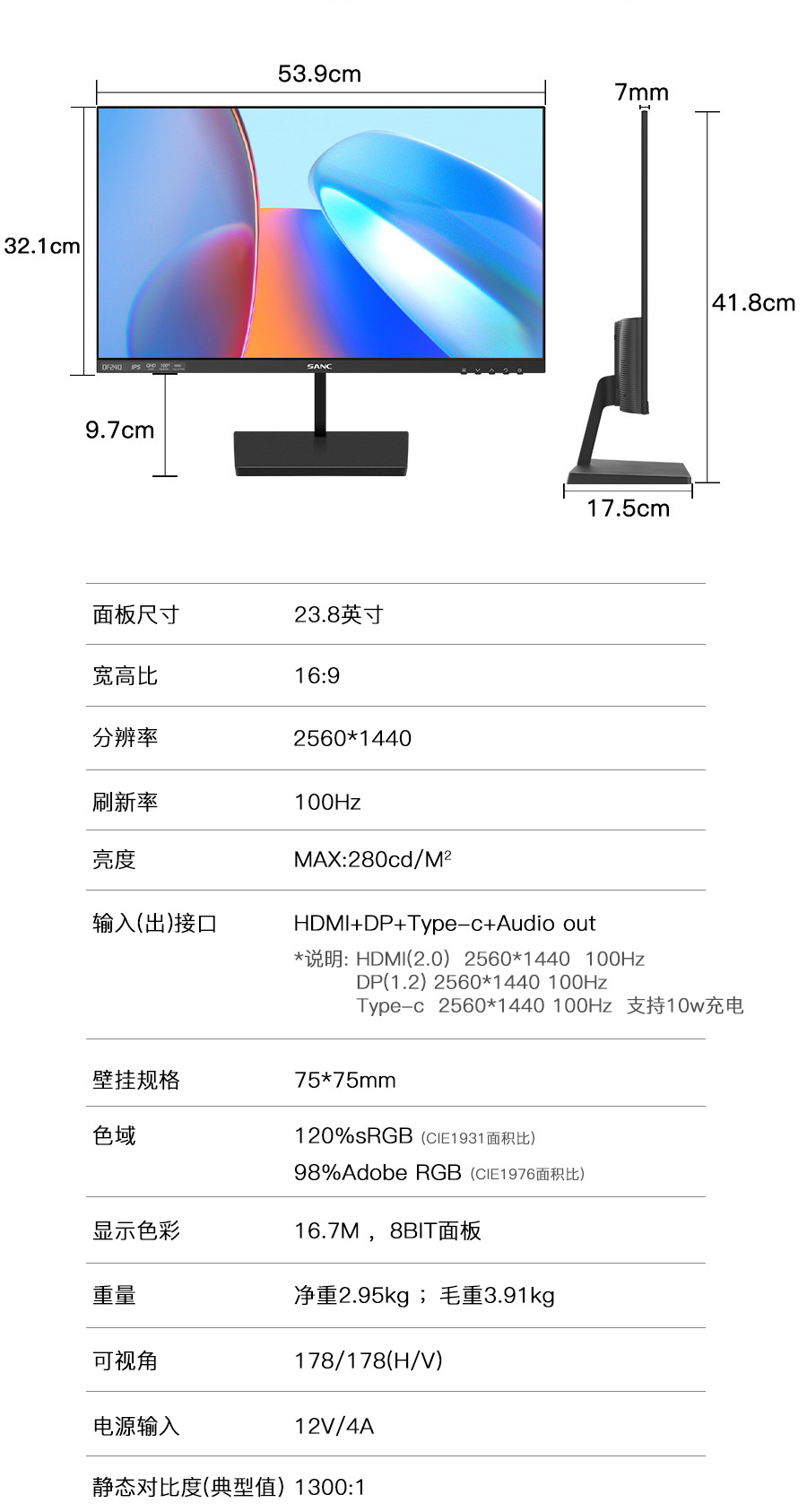 Type-C:2560*1440 100Hz 8bit 支持10w充电