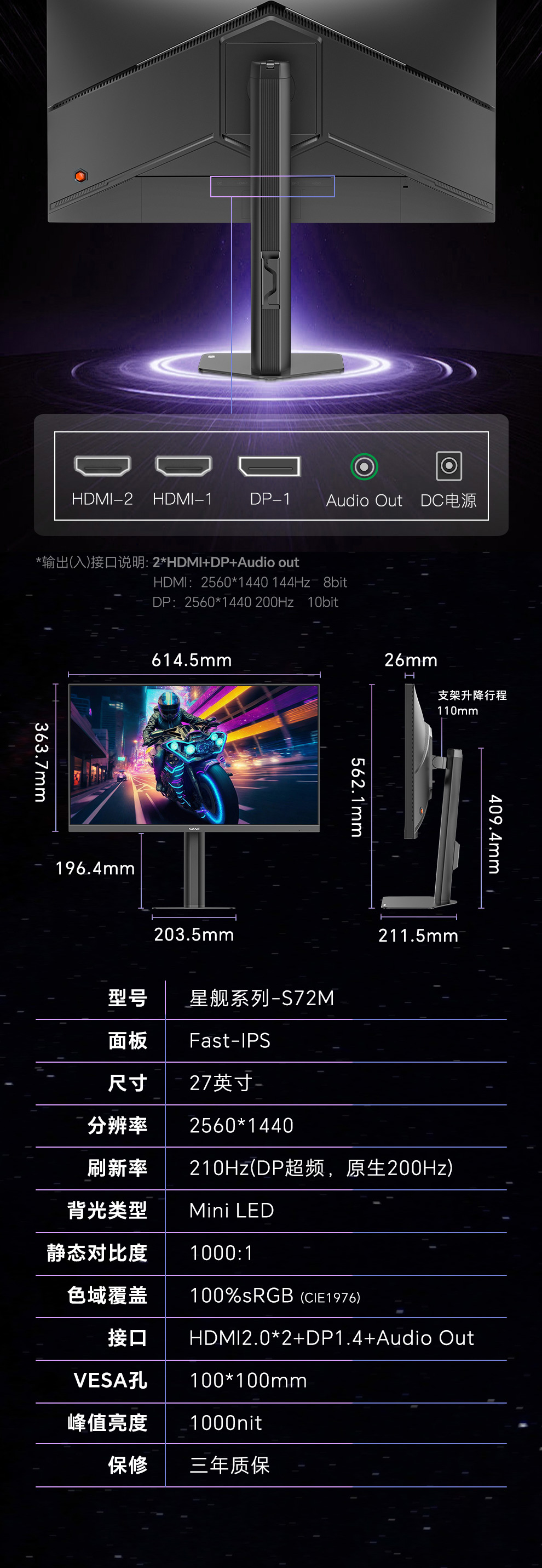 DP1.4  2560*1440 200Hz   10bit(8bits+FRC)